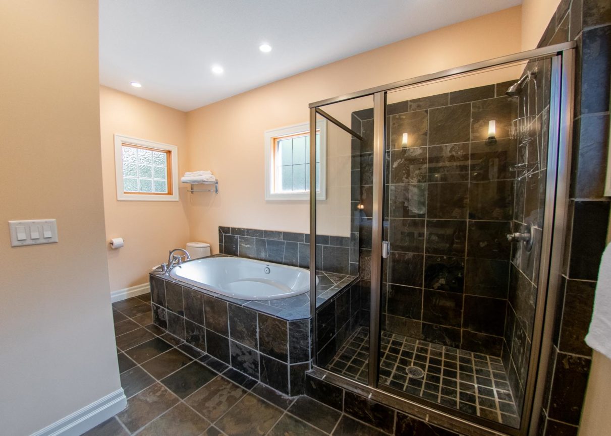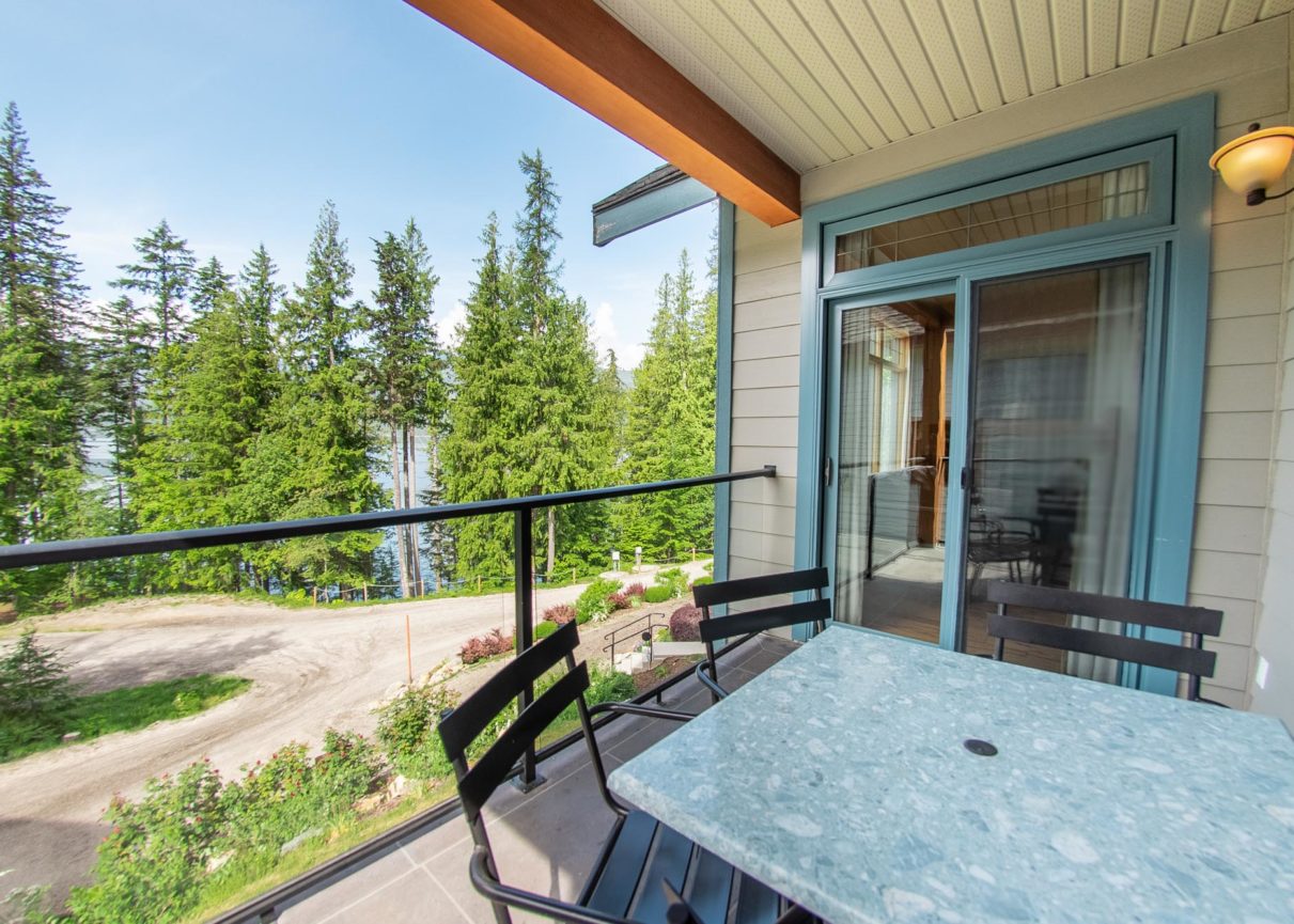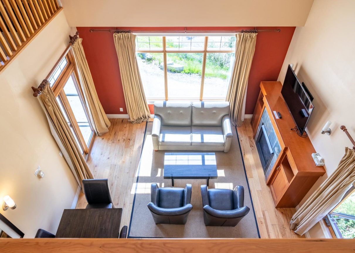 When it’s time to relax, a comfortable living area awaits you, fully equipped with armchairs, gas fireplace, Smart TV and a powder room. The Loft Chalet is the ultimate accommodation for your hot springs vacation at Halcyon Hot Springs Resort.Â