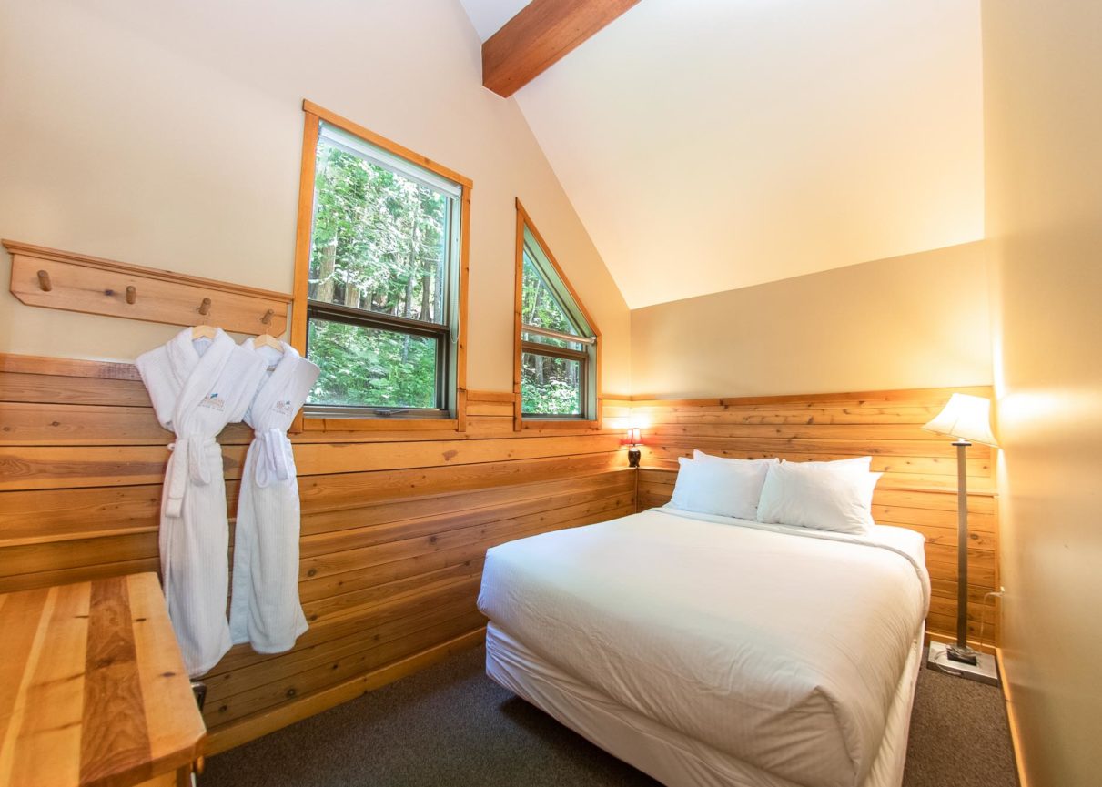 Our two-bedroom Chalets feature room enough to sleep six people comfortably, with two queen-sized beds in private bedrooms and a pullout queen-sized sofa in the combined living/dining area. The living area also features a Smart TV, a telephone and a cozy electric fireplace.Â